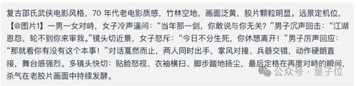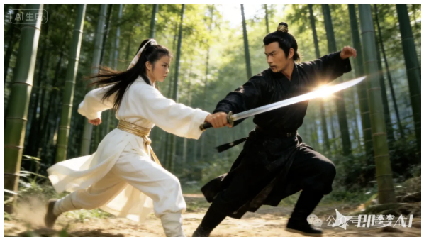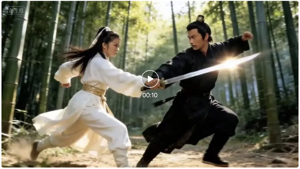 先来点开胃菜,最近网上邵氏武侠AI视频火得不行,于是我直接输入一张武林中人对打的动作写真照: