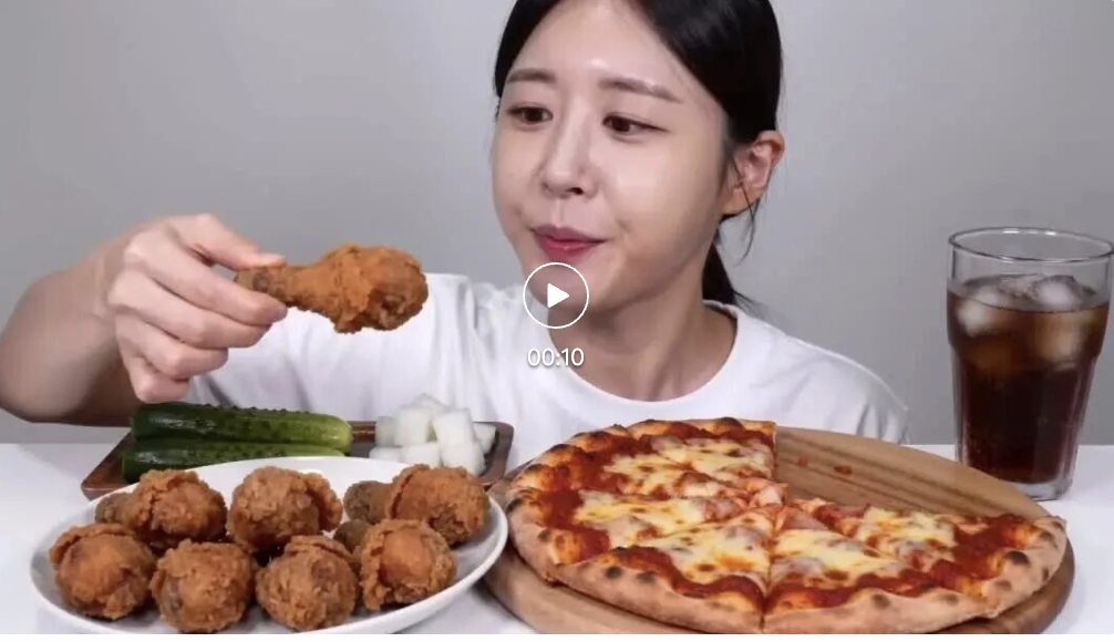 我们先来试一个非常考验音效能力的场景——吃播(流哈喇子,看看模型能不能准确还原不同食物咀嚼的声音: