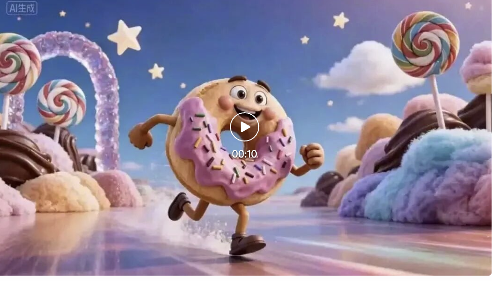 这次我给AI喂的是一张3D风格、正在奔跑的甜甜圈图片,要求它延长生成一段10秒的视频,并在过程中完成翻滚、跳跃、滑行等一整套连续动作: