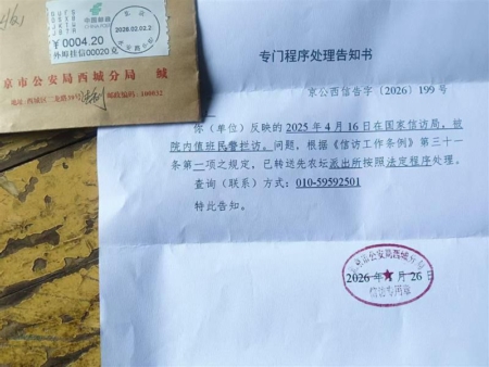 他贴一份“专门程序处理告知书”。该告知书是一位访民因在国家信访局里被拦访,向北京西城分局报案后警方的处理告知书。