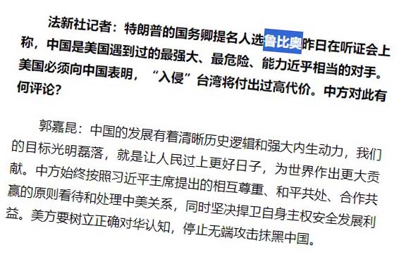 后来外界关注到,中共悄悄做了一个小动作。2025年1月16日,中共外交部官网发布的当天记者会文稿中,卢比奥的名字被译为“鲁比奥”。在此之前,中共官方一直使用“卢比奥”为官方译名。