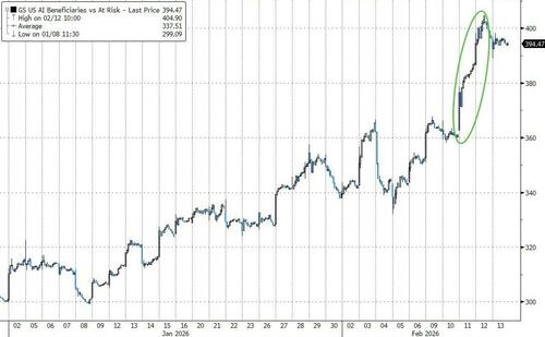 目前标普500指数今年以来在7000点关口前止步不前,未能实现突破,指数平静的表面之下暗流涌动。高盛的“AI领跑者与落后者”配对交易在上周创下了历史上最大的单日涨幅,但这主要是由做空“落后者”所驱动的。这种“先开火再瞄准”的做空情绪,正在软件等核心板块引发剧烈的叙事波动和风险转移。