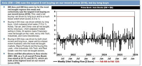 市场正陷入“AI颠覆一切”与“AI回报不够”的双重叙事博弈:前者引发对软件等“受害者”的恐慌性抛售(估值腰斩),后者则加剧对资本开支回报的严厉审视。资金正加速流向非美市场,韩国KOSPI创五年最佳单周表现,非美基金流入890亿美元远超美股的160亿,显示投资者正从拥挤的美股转向亚洲市场。