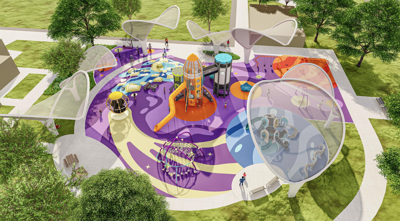 市府指出,Live Oak公园的游戏场整建工程于2024年8月动工,2025年6月21日正式对外开放。此次更新以“太空主题”为核心概念,打造火箭造型主体与太空站等元素,结合行星旋转设施、攀爬架、滑梯、秋千与彗星主题区等多元设施,同时增设遮阳棚、座椅与户外健身器材,营造兼具趣味性与功能性的亲子空间。