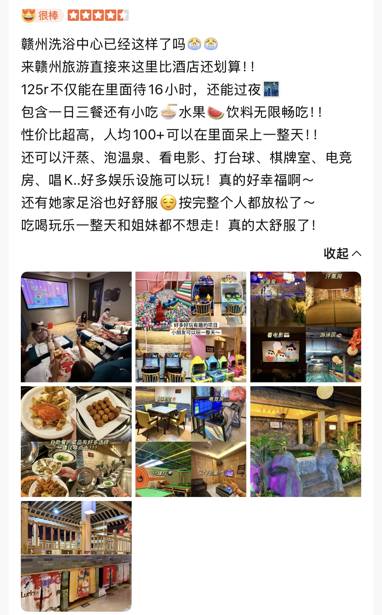 根据大众点评价格,在赣州,含过夜的水会,基础门票人均不到200元,其他城市也都在200元左右。这意味着什么?在上海深圳,这个价格可能只够看场电影加杯咖啡,但在洗浴中心,你能待上一整天,包含泡澡、汗蒸、休息、娱乐。