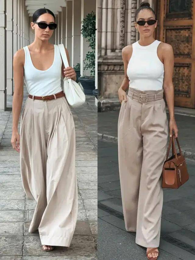 在南方城市天气比较暖和。我们可以选择用一件白色的修身款背心搭配上一条卡其色的阔腿长裤。这样的穿搭就属于松紧结合,不用你费心费力去搭配,就能呈现出凹凸有致的身材。