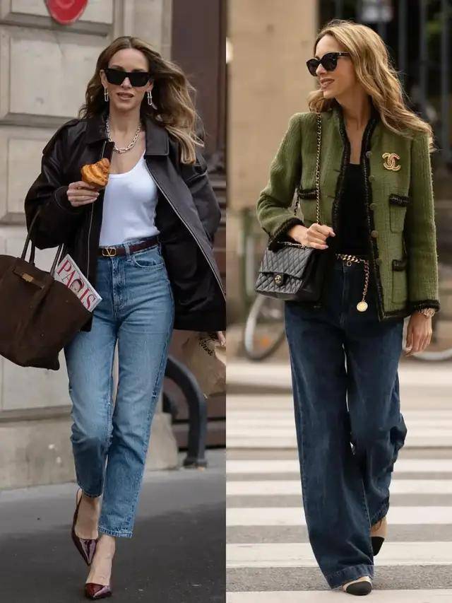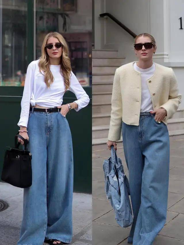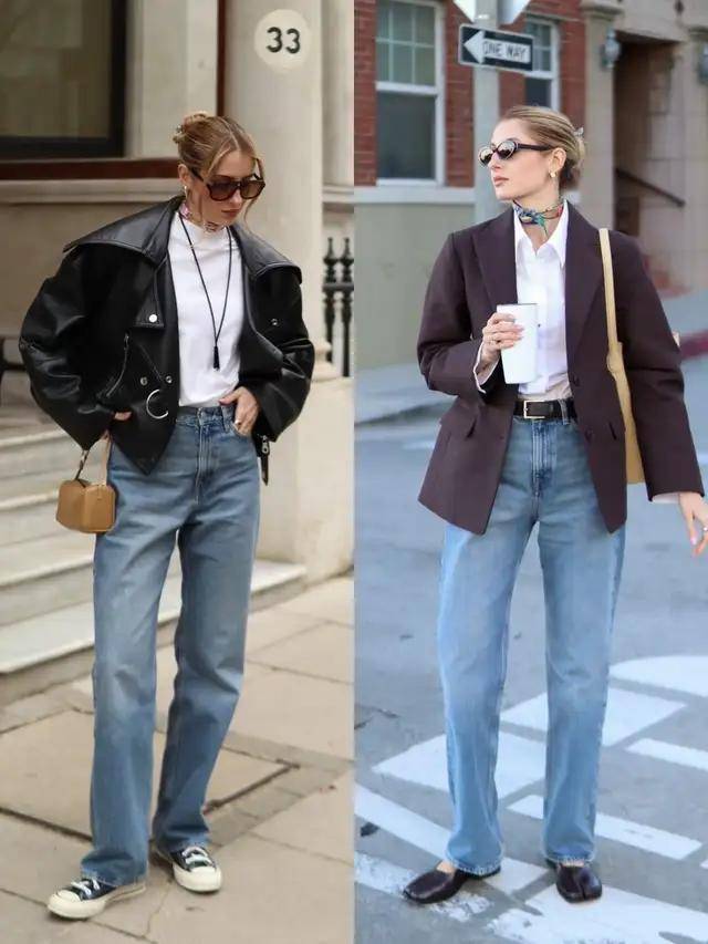 天气变得暖和,咱们就可以摆脱冬季的臃肿穿搭了,用一件白色的短袖 T 恤或者是无袖短款马甲,搭配上牛仔直筒阔腿裤,就能形成上短下长的搭配公式,可以形成高腰线,使得身材变成三七分的比例,让我们普通大众也能拥有大长腿。