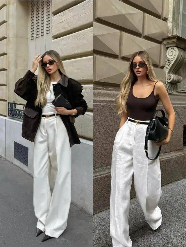 但是当我们换成阔腿裤,直筒裤就完全不同了,包容性很高,例如,我们可以选择白色的西装阔腿裤搭配上浅黄色的毛衣,脚踩黑色浅口单鞋,既遮肉又显洋气。