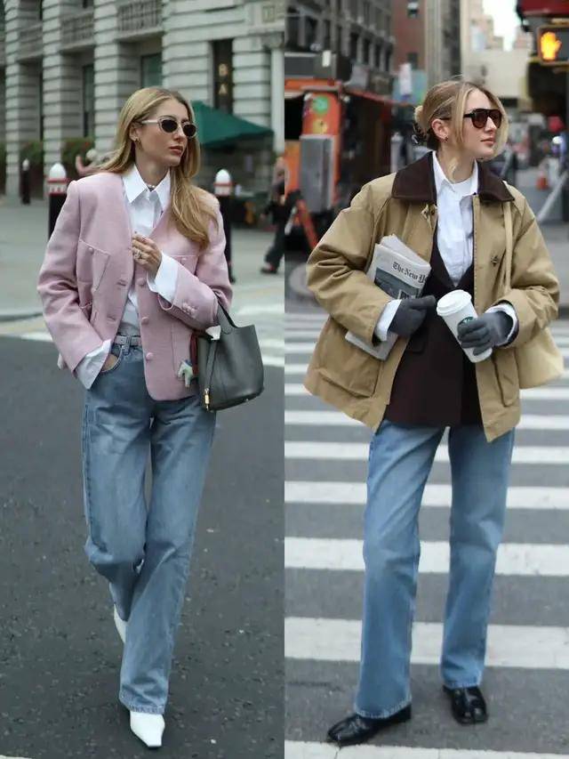 或是选一件浅黄色的西装,内搭白 T 恤,加上牛仔阔腿裤,这样的衣服配色很自然地让穿搭者显白显嫩,干练又不失精致感。