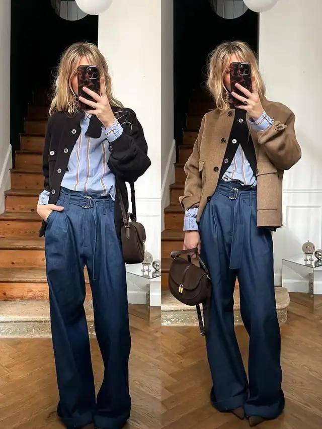 上衣无论是精致时髦的小香风外套,还是挺括有型的西装,都可以和阔腿裤完美搭配。散发出来的气质慵懒随性或是简约干练。