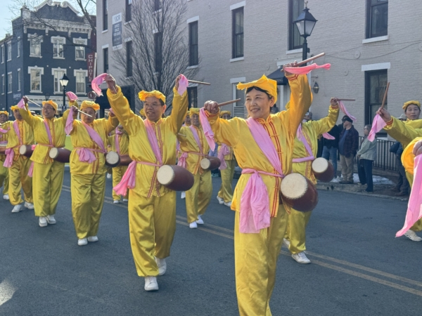 来自华盛顿DC和纽约的法轮大法腰鼓队员们身着鹅黄色传统服饰,身背橙色的腰鼓,精神抖擞,步伐整齐,奏响《法轮大法好》《喜庆》《新中国进行曲》等曲目。铿锵有力的鼓声振奋人心,充满节庆气氛。