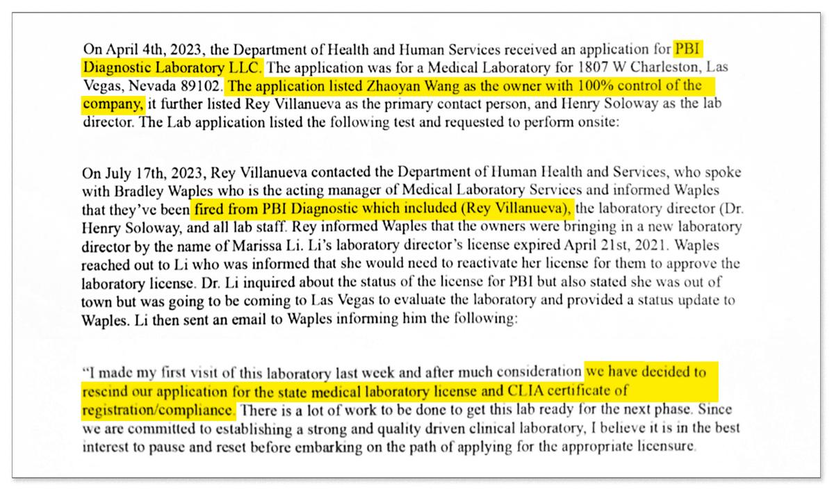 公开记录显示,王兆彦拥有的PBI诊断实验室有限责任公司(PBI Diagnostic Laboratory LLC)于2023年4月4日申请了医疗实验室许可证。该公司随后解雇了员工并聘请了一位新主管,该主管在官员与她会面处理申请之前撤回了申请。