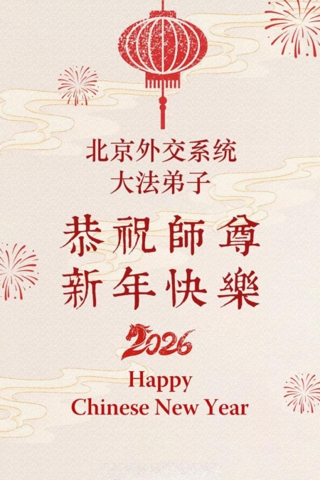 他们写道:“值此丙午年来临之际,北京外交系统大法弟子给慈悲伟大的师尊拜年,恭祝师尊新年快乐!惟愿师尊笑!合十”