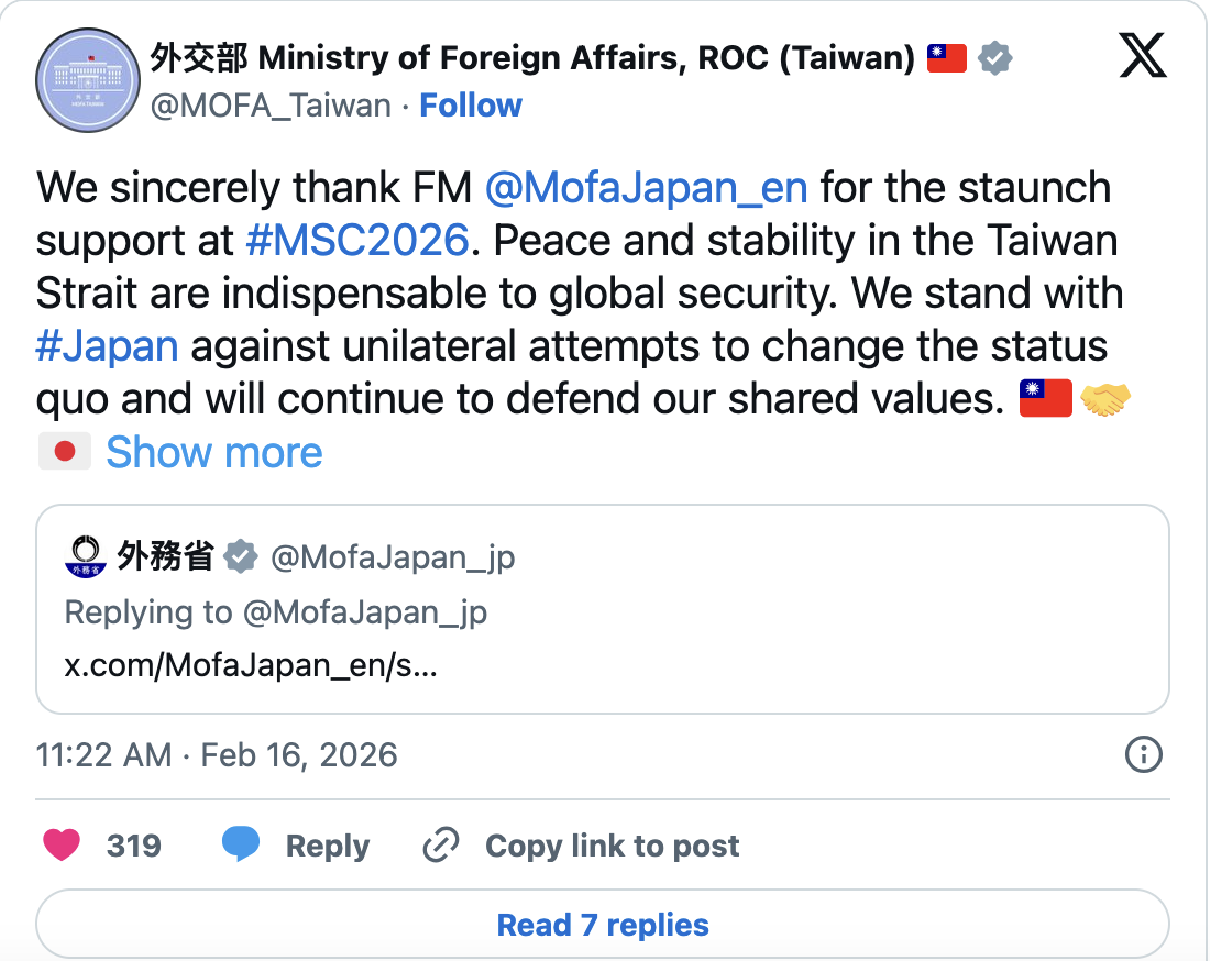 台湾外交部星期日在X平台发帖,对日本外务省的支持表示感谢。台湾外交部说:“台湾海峡和平稳定对国际安全不可获缺。我们与日本站在一起,反对单方面改变现状的企图,并将继续捍卫我们的共同价值。”