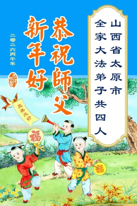 山西省太原市全家老少三代四位法轮功学员祝李大师过年好!