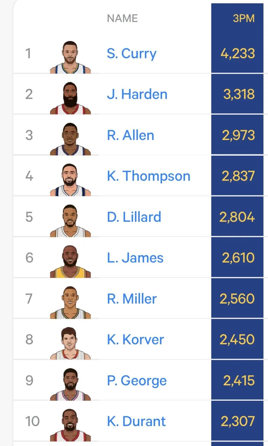 2021年之后,库里不断打破三分记录,超越雷阿伦登顶历史三分王、3000记三分、3500记三分、4000记三分,现在的他是NBA当之无愧的三分之神。