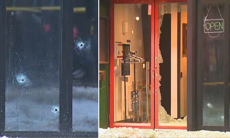 现场可见餐厅的玻璃门似乎被子弹击碎,另一扇窗户上还能看到三个弹孔。