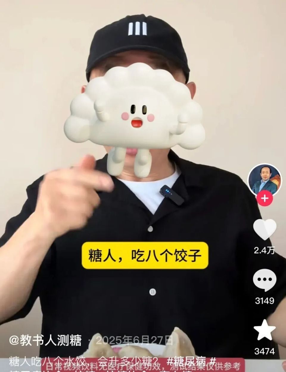 抖音@教书人测糖的视频中,他吃下8个大个、皮厚、肉馅饺子,不蘸醋、不加菜,餐前血糖为7.1mmol/L,餐后1小时飙升到12.5mmol/L,