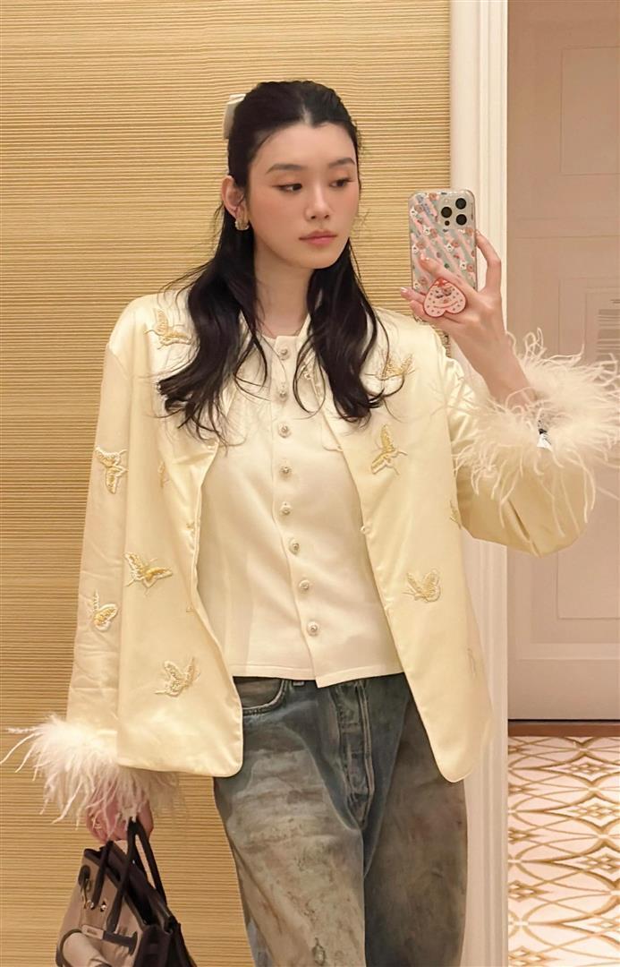 更绝的是她身上那件行头,白色刺绣的新中式上衣,袖口缀着鸵鸟毛,衣服上绣满了蝴蝶。