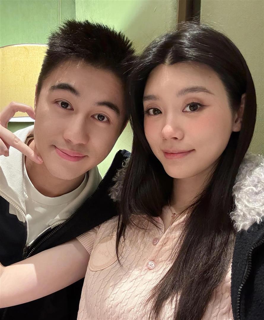 照片里她和何猷君穿着同款的淡粉色Dior针织上衣,何猷君在她身边俏皮地比着心。
