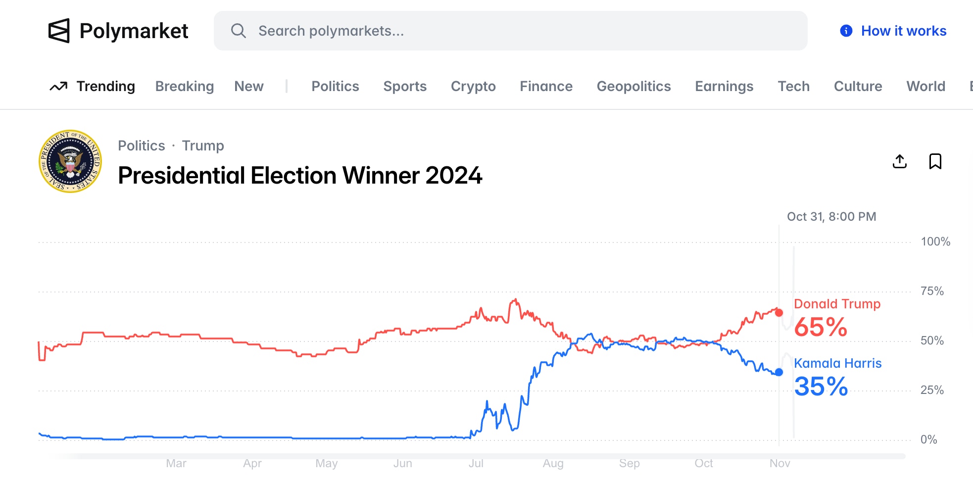 在2024年10月31日的大选前6日,川普在Polymarket上的胜算高达65%。(网站截图)