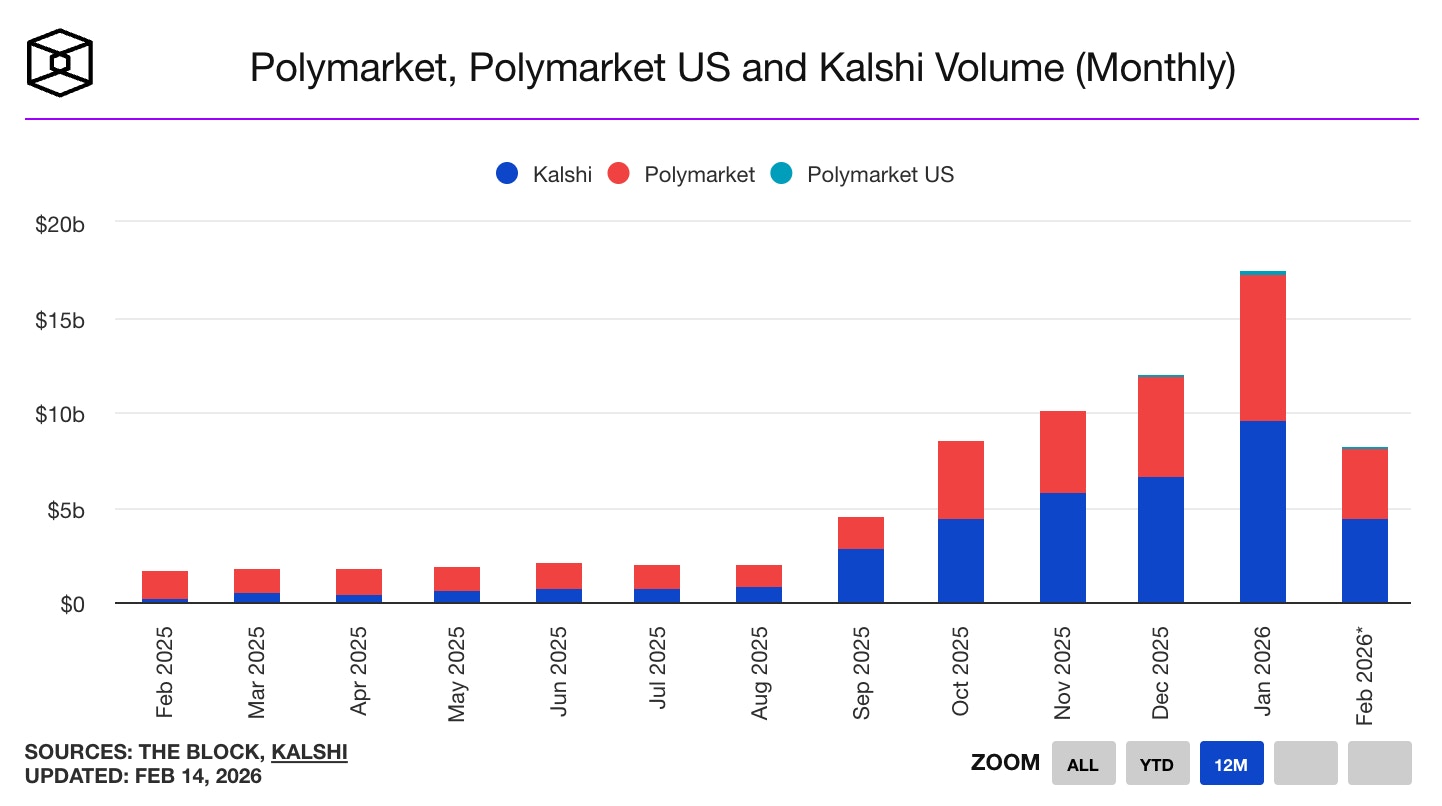 过去12个月的Kalshi和Polymarket月交易额(单位:十亿美元)。(The Block网站截图)
