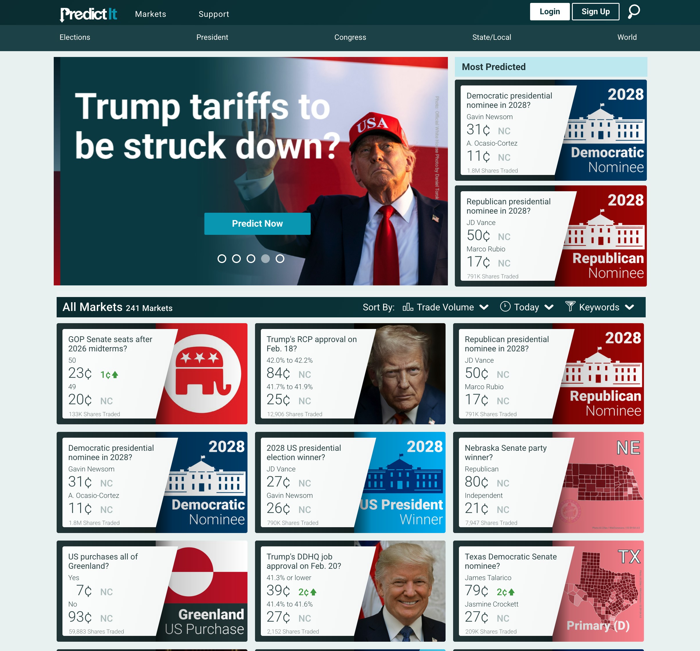 PredictIt首页:上面全是同美国政治有关的“赌盘”。(网站截图)