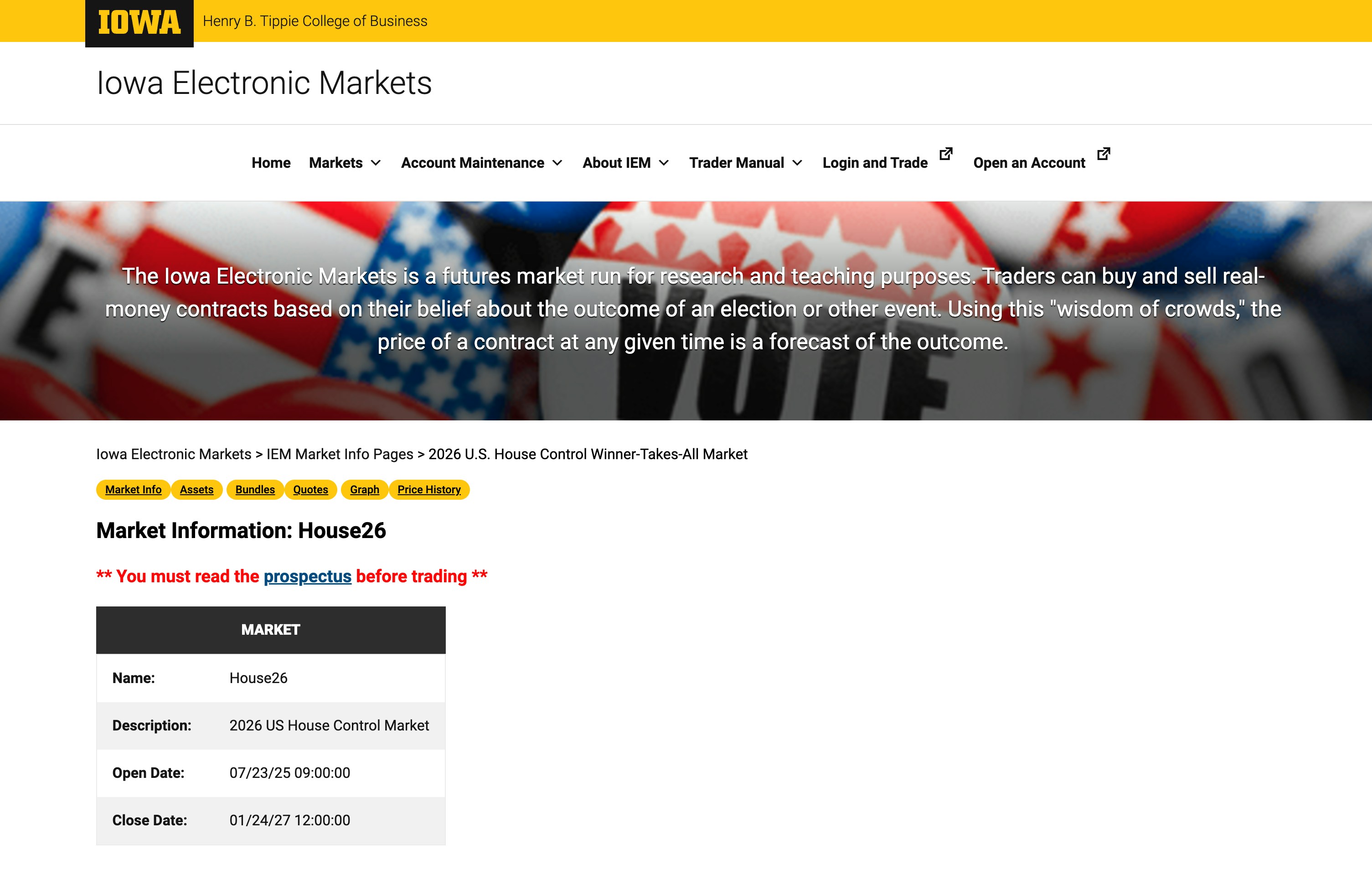依然在营运的“艾奥瓦电子市场”网站。图为其对于2026年国会众议院的预测市场页面。(网站截图)