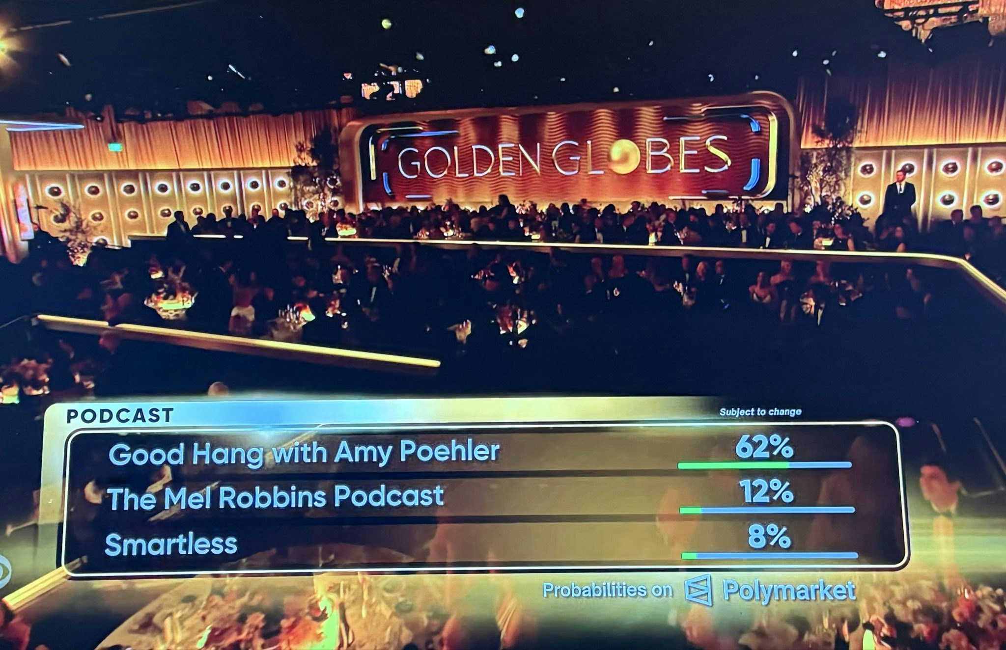 2026年金球奖(Golden Globes)颁奖典礼展示Polymarket有关获奖预测的“赌盘”。(X@milkkarten)