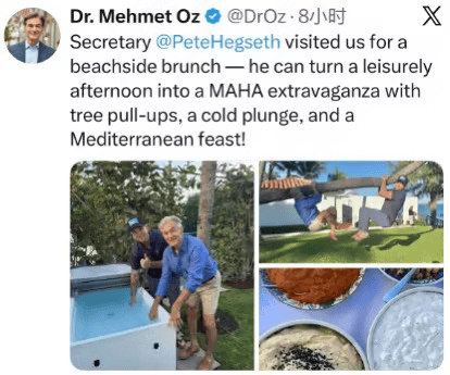 据美国《纽约》杂志报道,美国联邦医疗保险和医疗补助服务中心主任穆罕默德·奥兹当地时间2月18日在社交媒体X上晒出他与赫格塞思一起度假的照片。奥兹写道,“皮特·赫格塞思部长到访与我们一起享用海滨午餐。他能通过扒树引体向上、冷水浴、地中海美食,让一个悠闲午后变成一场精彩盛宴!”