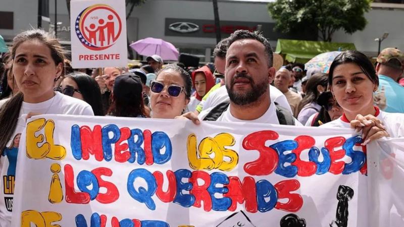 他手持写着“释放西莉亚”的横幅,其他人则举着英文标语牌,如“美帝滚回家”或“让他们回来”。
