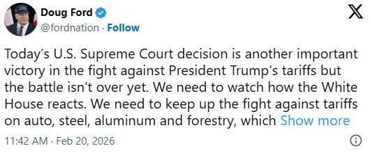 省长在X平台的一篇帖子中写道,“我们需要观察白宫将如何作出反应。我们必须继续对抗汽车、钢铁、铝和林业领域的关税,这些关税仍然存在,并继续伤害我们的工人,”“在针对加拿大的每一项关税都被取消之前,我不会停止斗争,这样我们才能发展经济,并在边境两侧创造就业机会。”