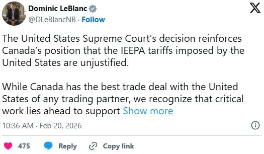 他在X平台的一篇帖子中表示:“美国最高法院的裁决加强了加拿大的立场,即美国依据IEEPA实施的关税是不合理的。”