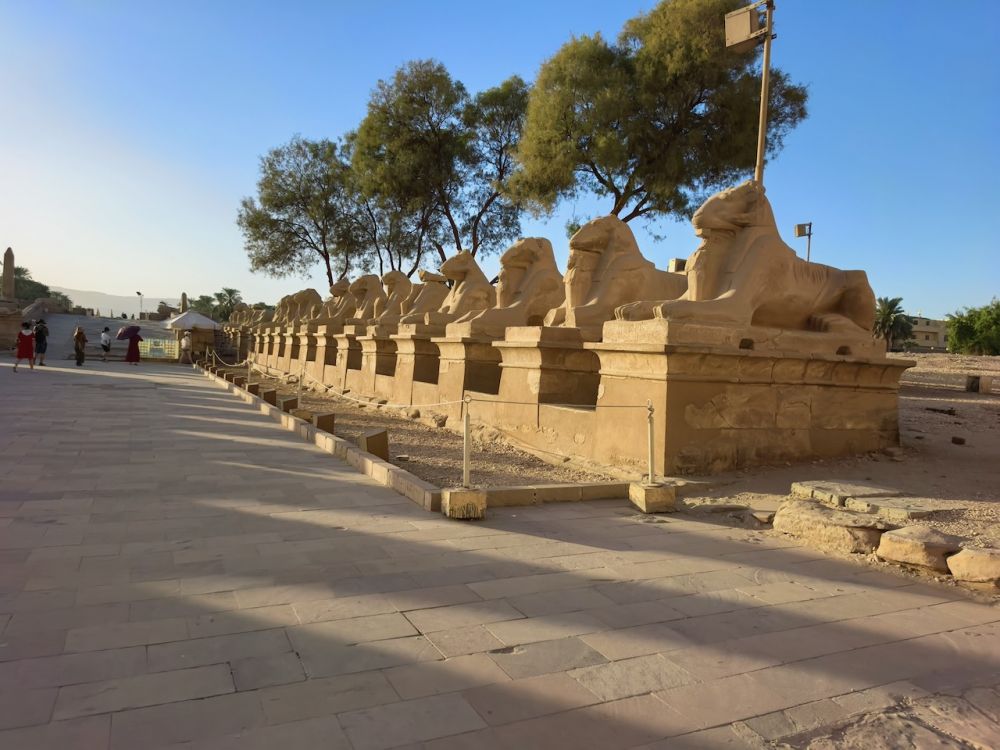 码头与神庙之间相连接的是司芬克斯大道(Avenue of Sphinxes),又叫祭奠之路、公羊大道,由40座羊首狮身石像(Ram- headed Sphinxes)组成。公羊是太阳的象征,每只公羊前面有拉美西斯二世的小雕像,表示法老是太阳神之子,得到太阳神的庇护。这条祭奠之路原来很长,共有124座公羊狮身石像,在第一塔门修建之前的1000多年间,它直通第二塔门(当时神庙的入口,最外层塔门)。第一塔门修建时,将其中84座移至第一庭院。