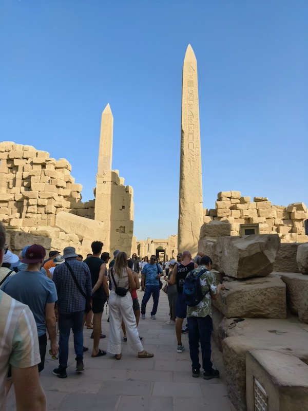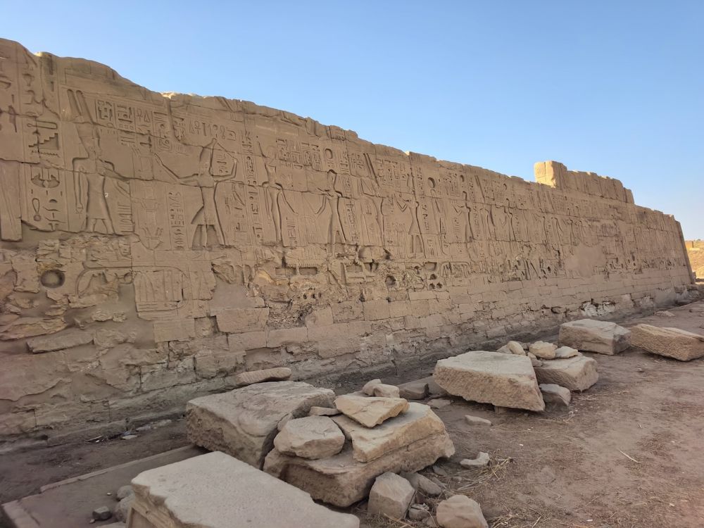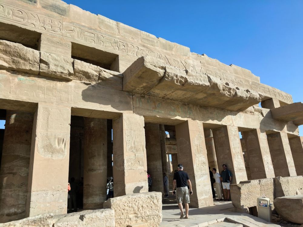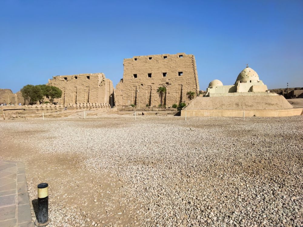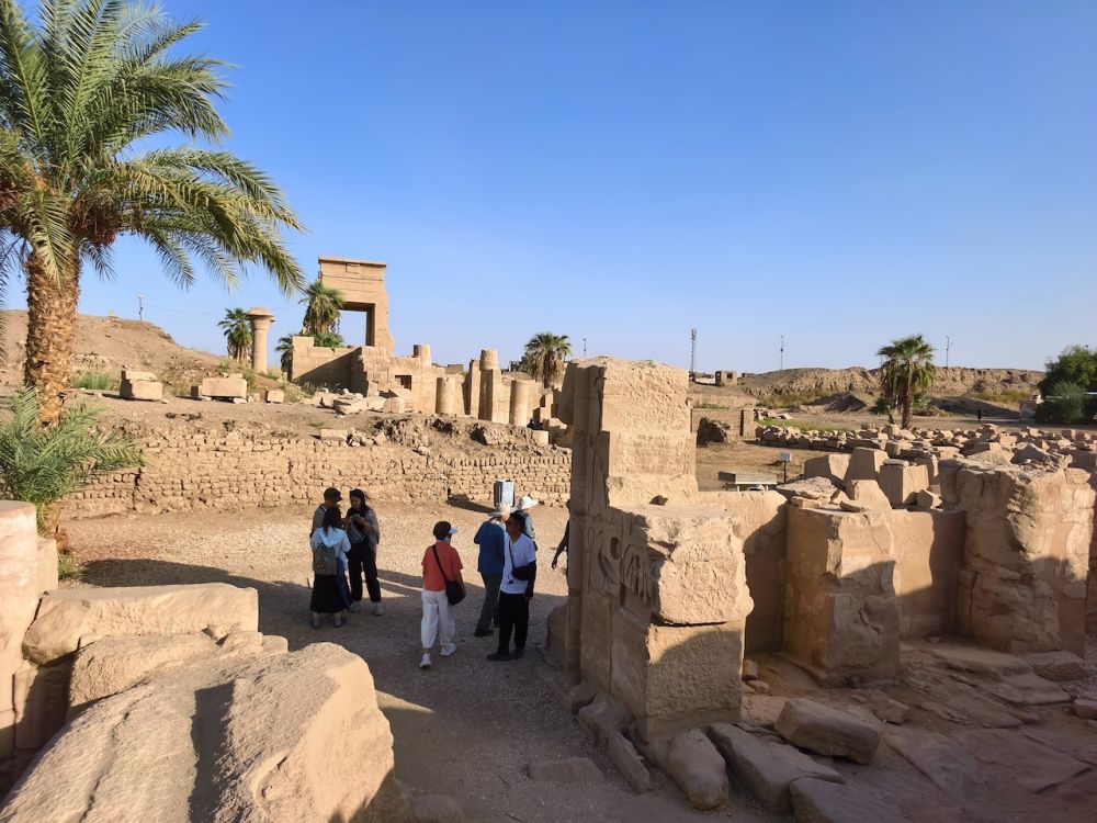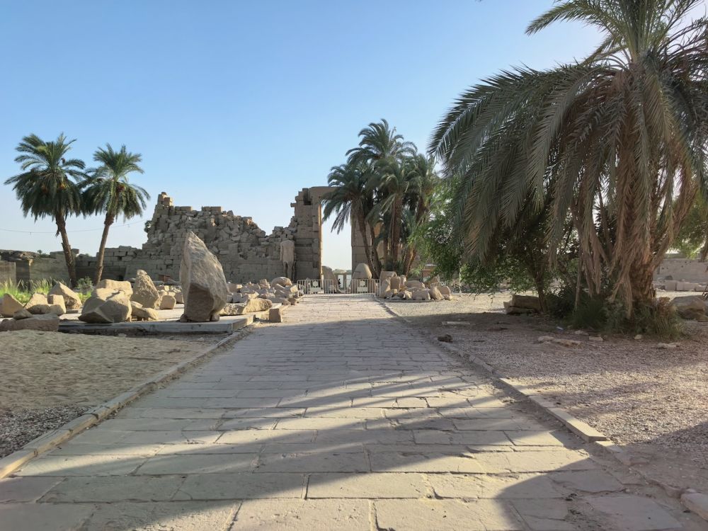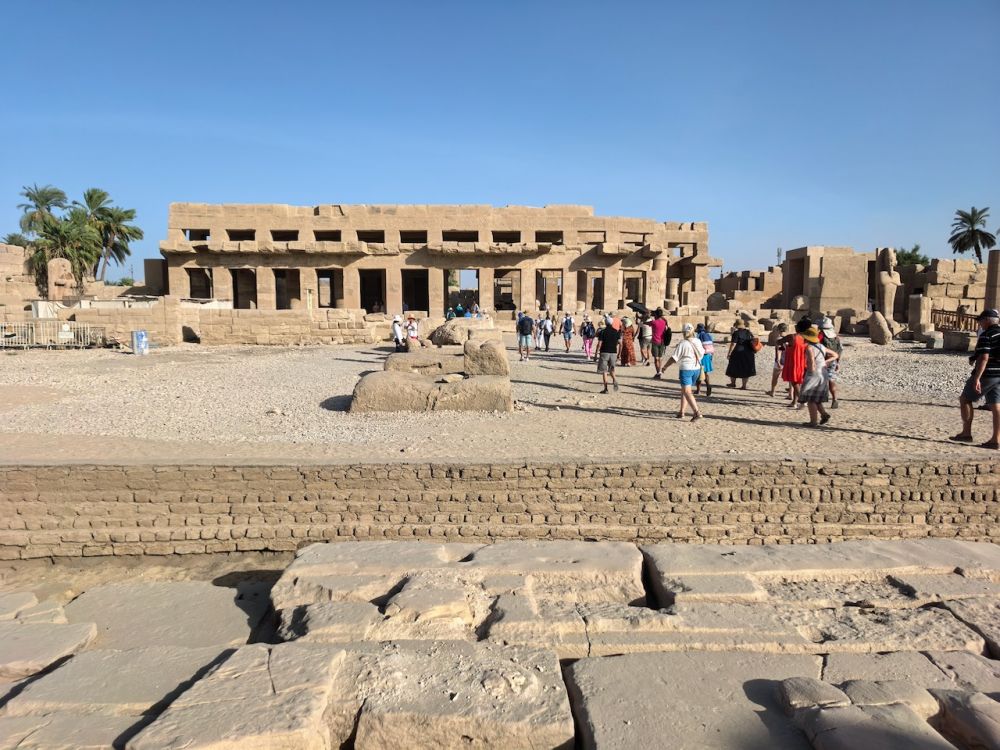 走过节日大厅,东西线重要的遗址基本已经看完。远处是拉美西斯二世建造的倾听的耳朵神庙(Temple of the Hearing Ear)。古埃及只有法老和祭司才能进入神圣的神庙,普通人只能在特定地点祭拜。这座倾听的耳朵神庙是为百姓建造的,他们在这里祈祷神祇能够听到自己的声音。我们 还有南北线没有看,就不继续向远处走了。