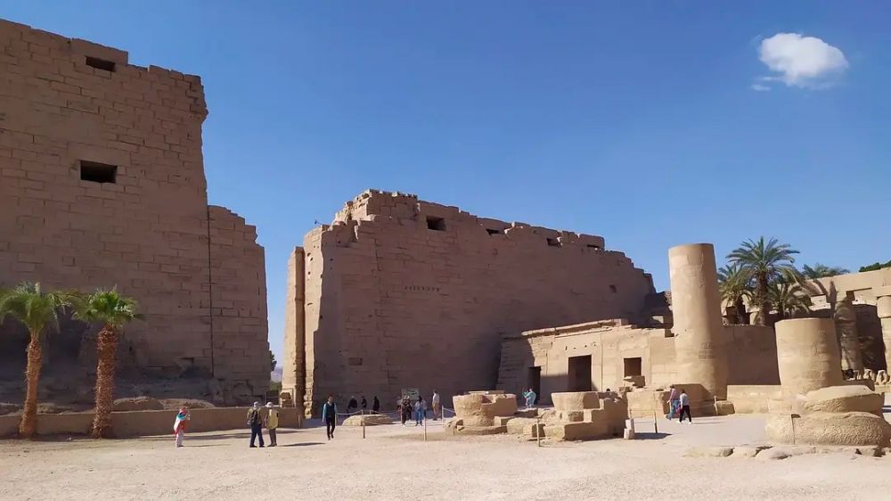 庭院东南角是拉美西斯三世(Ramesses III)神庙,石柱前排列着法老的雕像