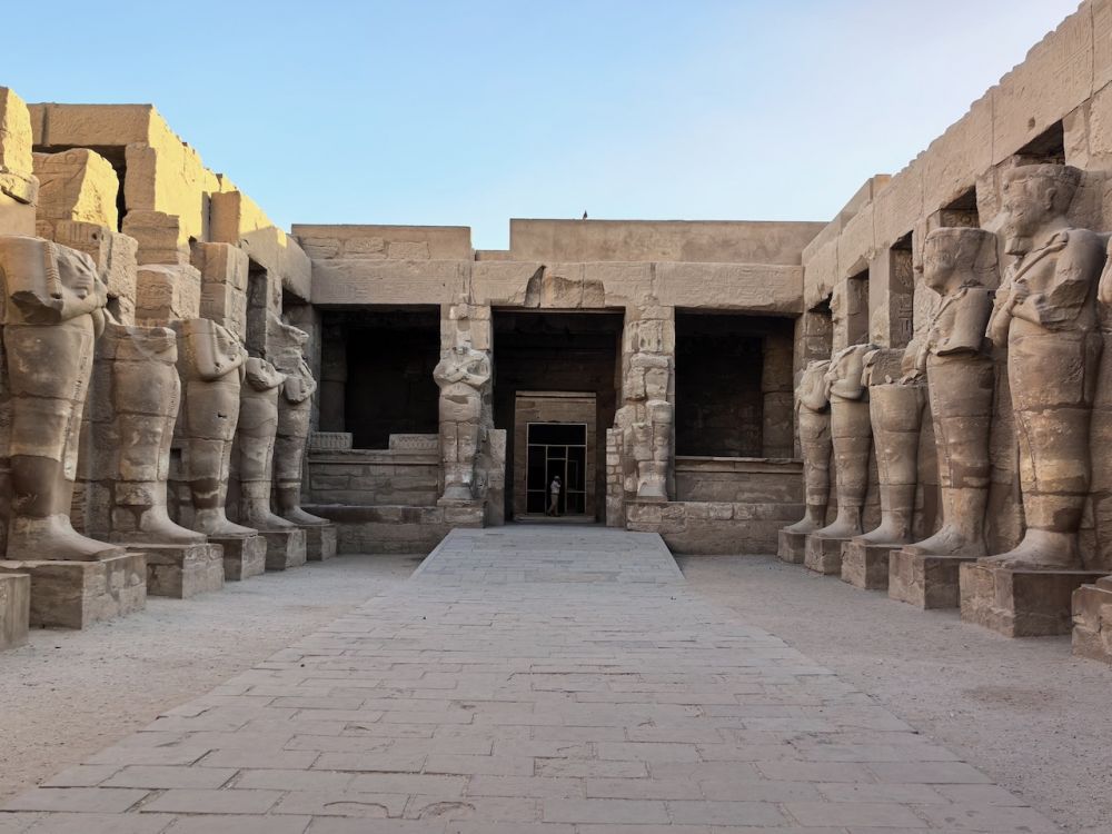 第五塔门后方是图特摩斯一世修建的横向走廊,坐落一排奥西里斯(Osiris)的形象的法老雕像。奥西里斯是冥神,掌管冥界、农业、丰饶和生育,象征重生和永生。