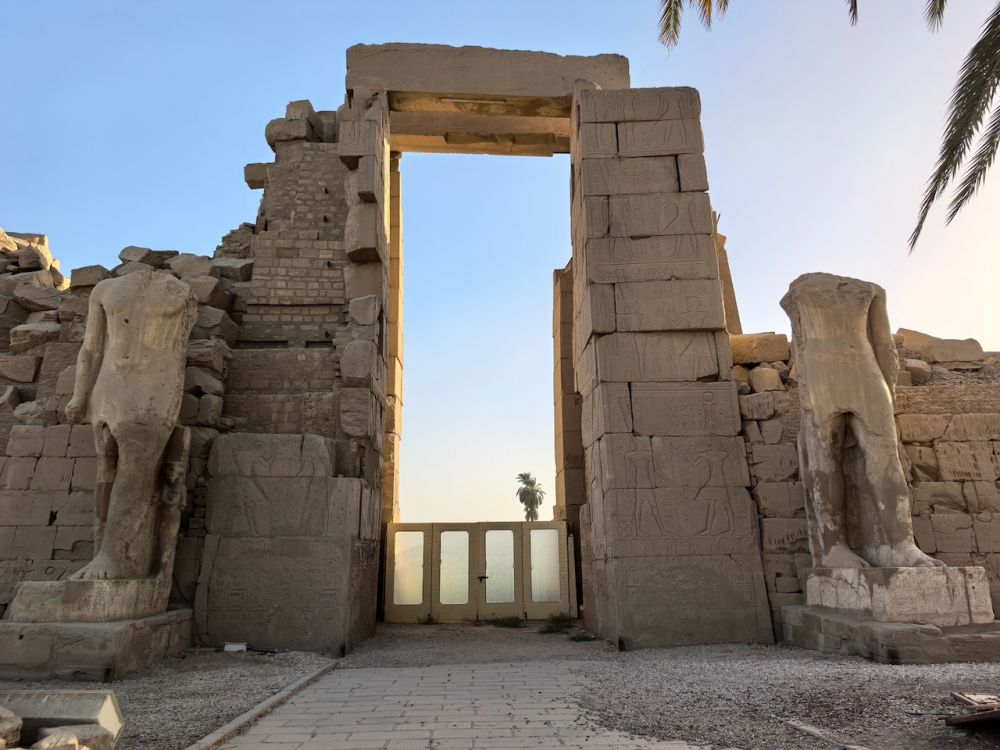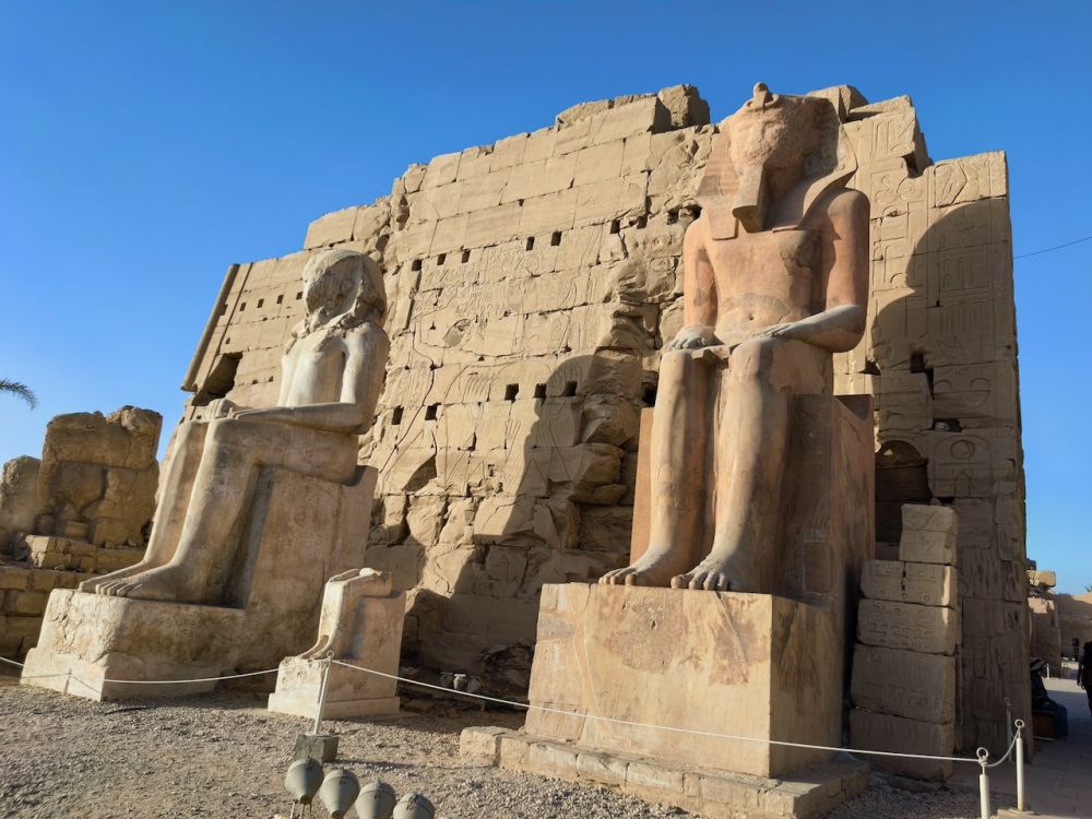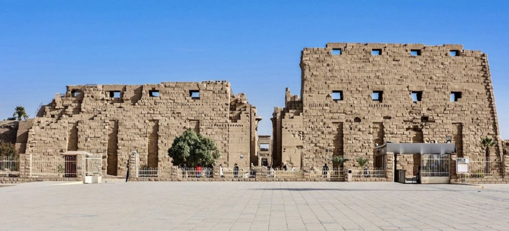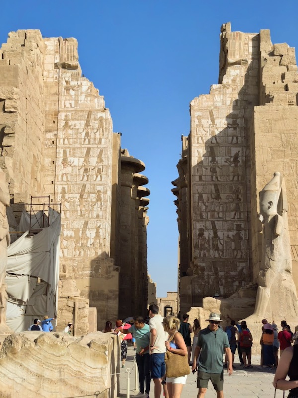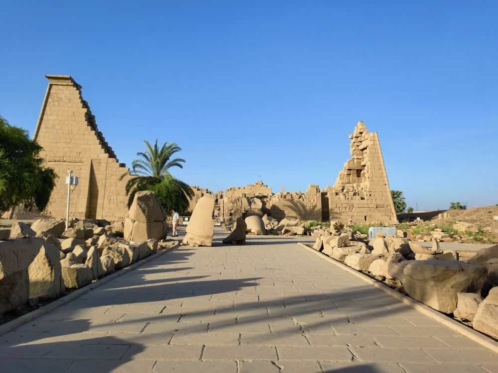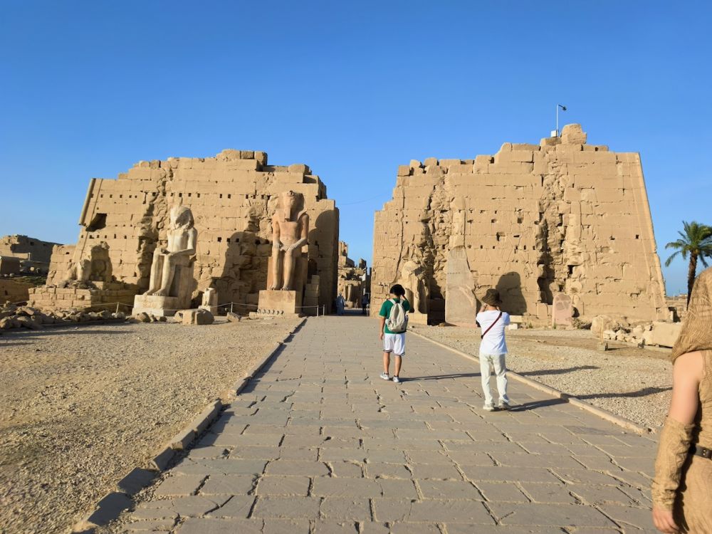 第一塔门(First Pylon),它其实是卡纳克神庙建造的最后一个塔门,修建于托勒密王朝晚期。由于国力日渐衰微,塔门始终没有完工。眼前的塔门石头切割粗糙、没有表面装饰,但塔门长129米、高43米,厚15米,巨大的体量,还是相当壮观。