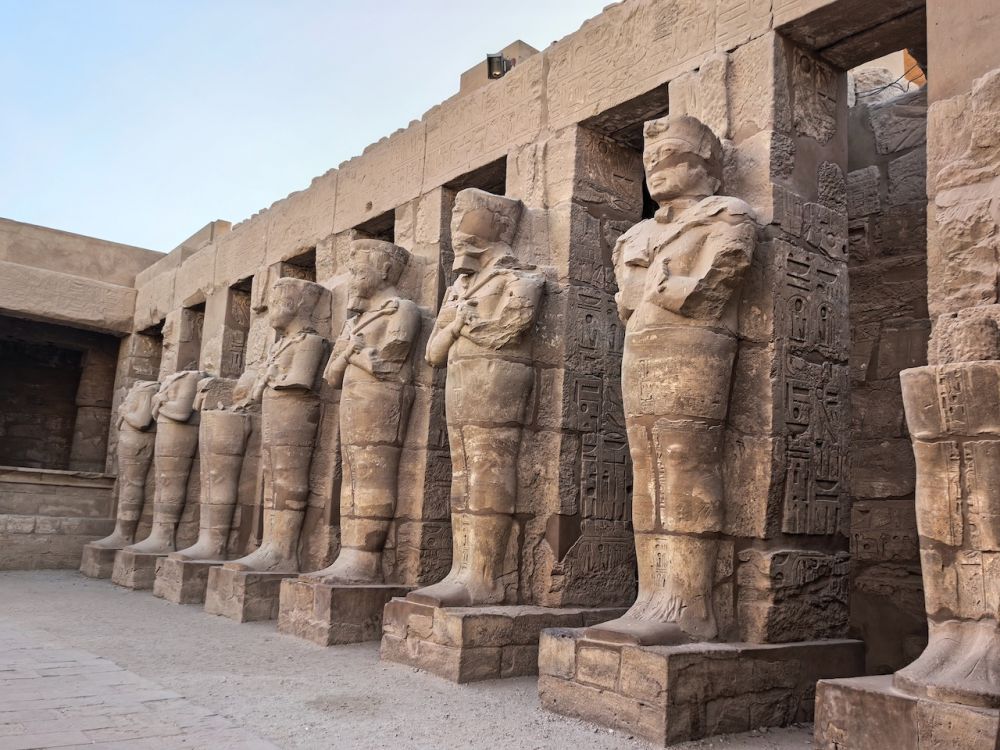 并将被自己打败的民族、国王的名字都刻在墙上,满满一面墙,真可谓功勋卓越。第七塔门前的庭院里,曾经出土大量中王国和新王国时期的文物,其中真人大小石雕像有780座,青铜小雕像17000多尊。大部分文物现收藏在开罗博物馆,并不清楚如此大量的雕塑为什么会埋藏在这里。