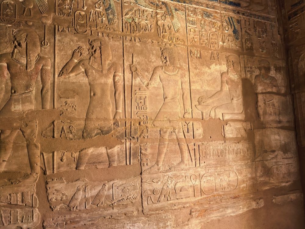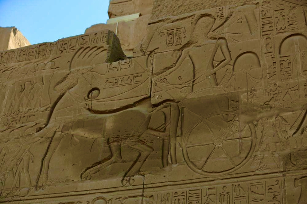 大殿内外墙壁刻满了法老的军事成就和宗教仪式。北部墙上雕刻着塞提一世的战绩,南墙是拉美西斯二世的功绩。