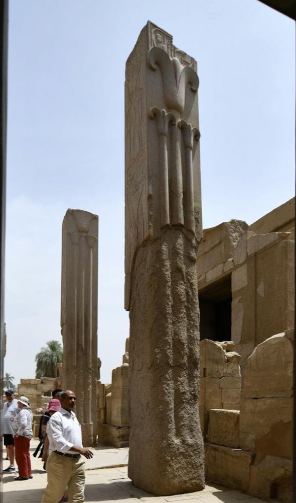 门口两根纹章柱,与常见的埃及石柱不同,它们造型别致,一根雕刻莲花象征上埃及,另一根为纸莎草象征下埃及。