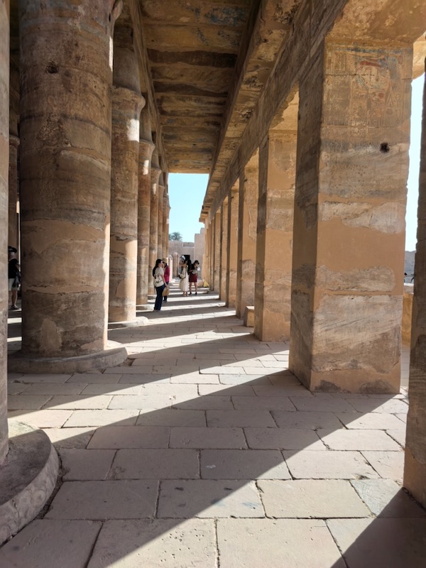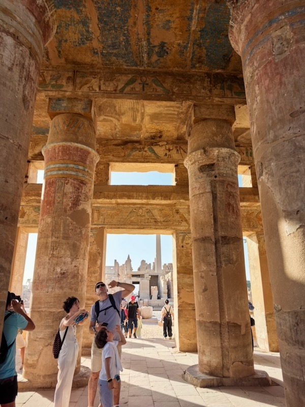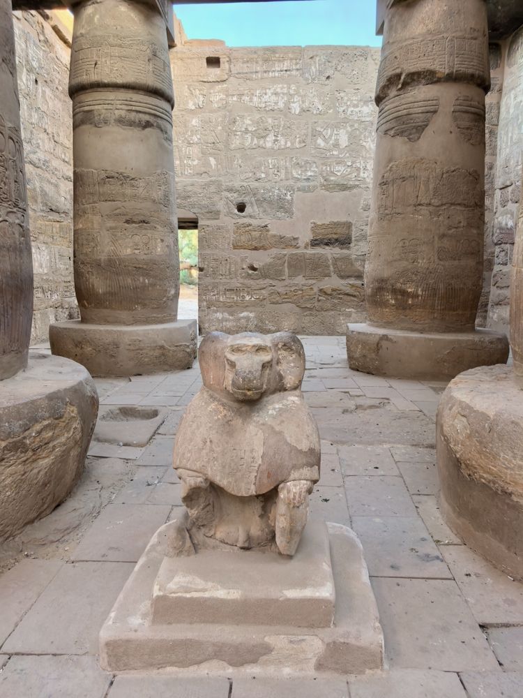 南北轴线上看点不多,游人也不多,偶尔可见三三两两几个人。我们顺着中轴线穿过一道道塔门,很快来到最后的第十塔门。正准备原路返回,一位穿制服的工作人员,向我们招手,表示跟他走。我们跟着他穿过一片宽敞的空地,来到一座保存完好的神庙前,这是孔苏神庙。孔苏是底比斯三柱神体系的核心成员,与太阳神阿蒙、母神穆特构成新王国时期最重要的神祇组合。