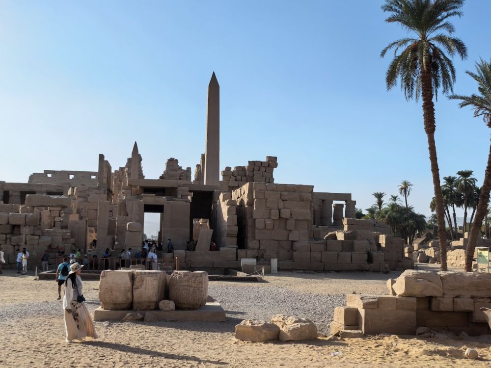 图特摩斯一世之女,哈特谢普苏特也不遗余力大兴土木,建起红色石英岩圣殿,用以存放太阳船和阿蒙神像。在第四和第五塔门之间,伫立着女法老哈特谢普苏特(Hatshepsut)献给太阳神阿蒙-拉的方尖碑,以庆祝她任法老16周年。顶部用金银合金制成,非常华贵,碑高29米,是埃及境内现存最高、也是保存最好的一座方尖碑。方尖碑一般都是成对的,另一座已经倒塌,断掉的半截如今竖立在圣湖广场上。