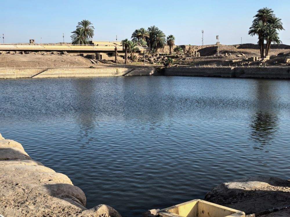返身回到第四塔门,向南过圣湖,是卡纳克神庙的第二个中轴线。由北向南,第七到第十塔门都坐落在这条南北轴线上。首先我们来到圣湖(Sacred Lake),圣湖由阿蒙霍普特三世修建,与尼罗河相连,历经几千年不干涸,是祭司们敬奉神明仪式前沐浴净身的地方。