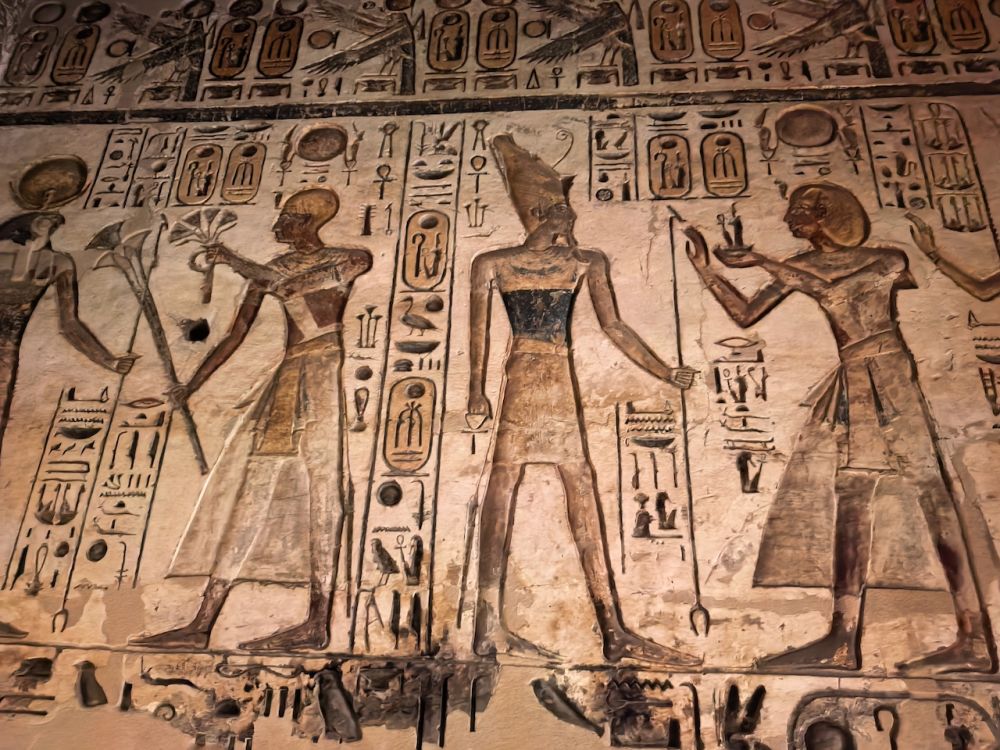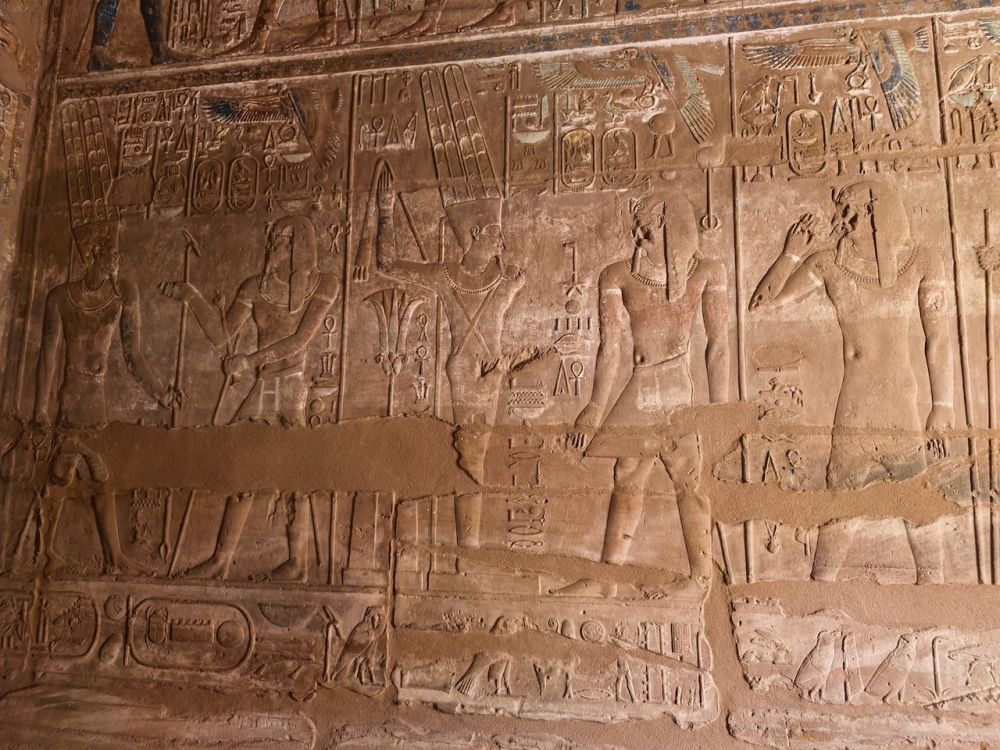 大厅北部是塞提一世时期建造,当时流行凸雕,南部是拉美西斯二世建造,为凹雕。不同时期的工艺形成鲜明对比,凸雕做工精细,凹雕不太注意细节,没有刻意塑形。