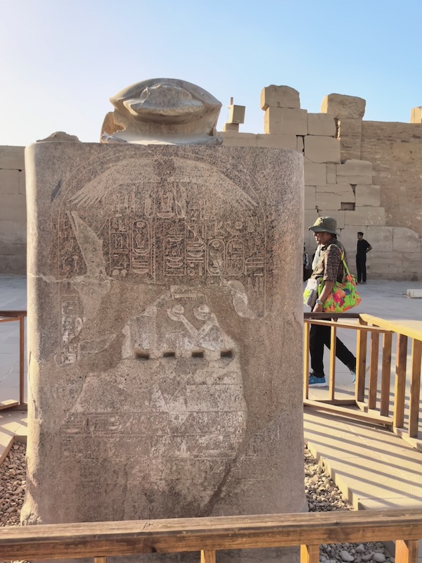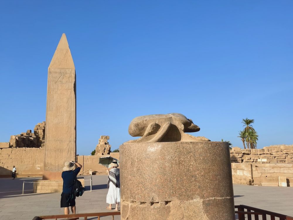 圣湖广场上有一巨型花岗岩基石,上面摆放一只圣甲虫雕像。圣甲虫在古埃及象征重生和保护,代表太阳神之一的阿图姆-凯普瑞神(Atum-Khepri)。它原位于阿蒙霍特普三世神庙,是四个相同石像中仅存的一座,后被25王朝塔哈卡尔法老(Tahakar)移到现在的位置。埃及一种说法:逆时针环绕雕像转7圈,圣甲虫就会帮助实现一个心愿。因而,不时可以看到游客围绕圣甲虫转圈,我有些奇怪,难道他们转完圈真的会许愿吗。