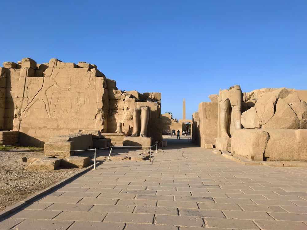 走出售票大厅,远远可见神庙高高耸立。首先来到的是阿蒙码头,在古埃及欧佩特节日(Opet Festival)期间,人们抬着阿蒙神像在这里上船前往卢克索神庙,举行象征神性更新和王权神圣化的仪式。古埃及人认为,每年农业周期结束后,众神和大地都会变得疲软,需要从混沌宇宙中吸取新能量。欧佩特节就是实现能量再生的仪式,每年在卡纳克神庙和卢克索神庙举行。节日持续27天,人们抬着阿蒙神像游行,从卡纳克出发前往卢克索神庙。码头原有四座4米高大方尖塔,目前仅剩一座,河水也已干涸。