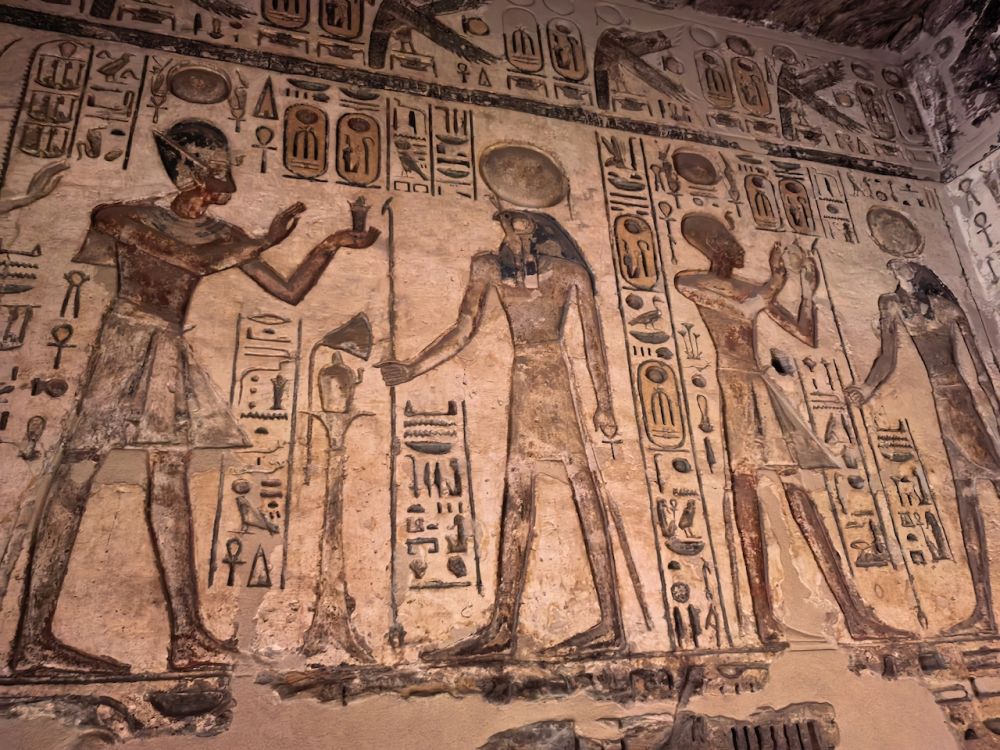 石柱和墙壁上的壁画颜色依然鲜艳,但许多文字和浮雕都以被毁