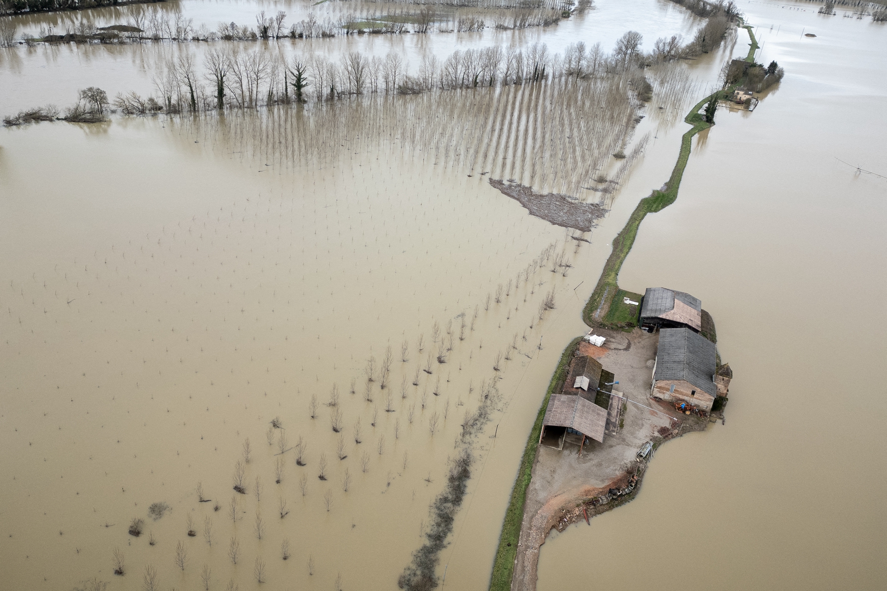 2026年2月20日,受连续降雨及风暴“尼尔斯”(Nils)和“佩德罗”(Pedro)的叠加影响,法国西部的加龙河(Garonne River)水位暴涨,导致沿岸托南斯村(Tonneins)的大片农田被淹。(Lionel BONAVENTURE/AFP via Getty Images)