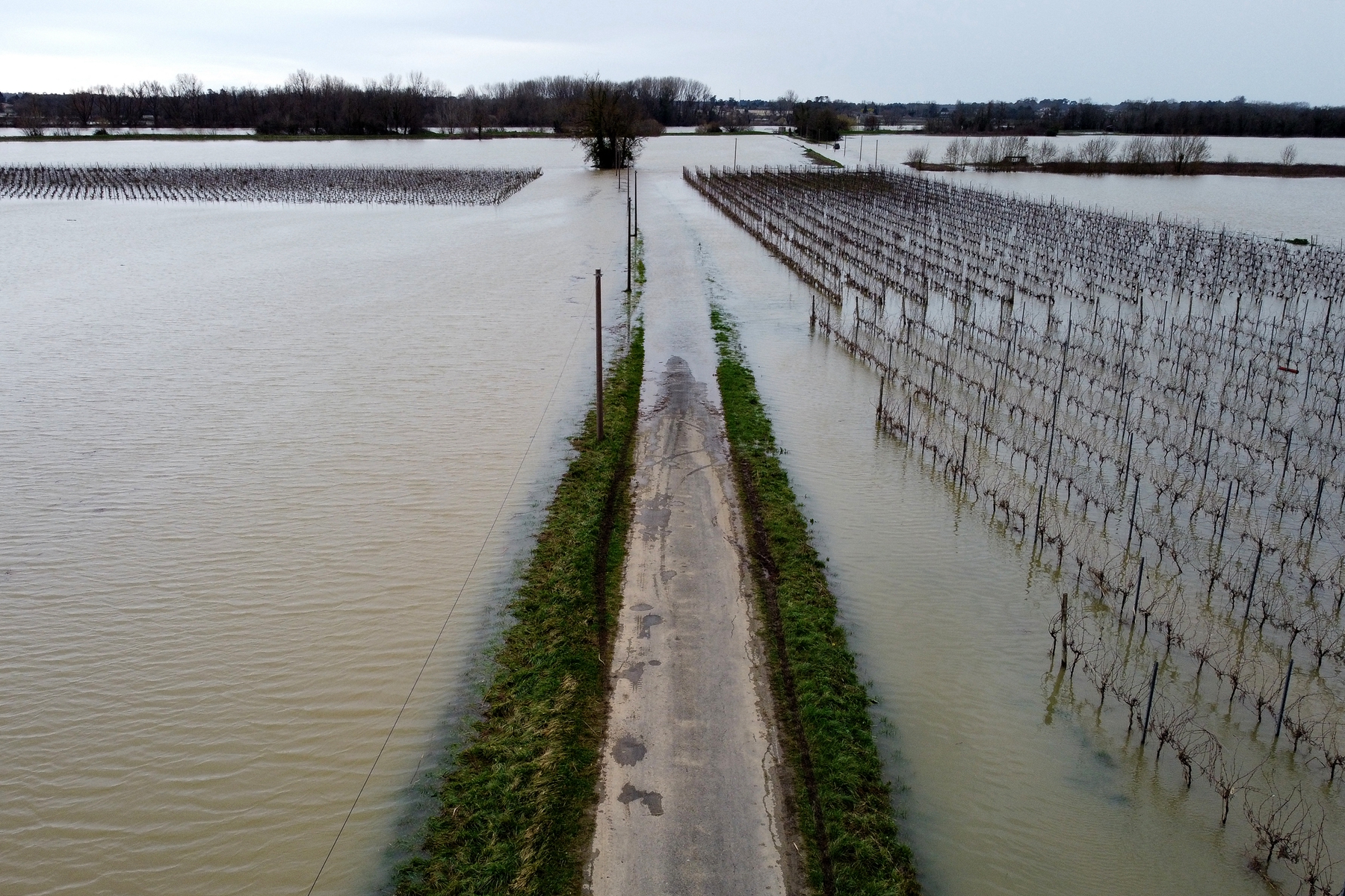 2026年2月18日,暴雨过后,法国西南部城镇勒图尔讷(Le Tourne)的大片葡萄园被淹。(ROMAIN PERROCHEAU/AFP via Getty Images)